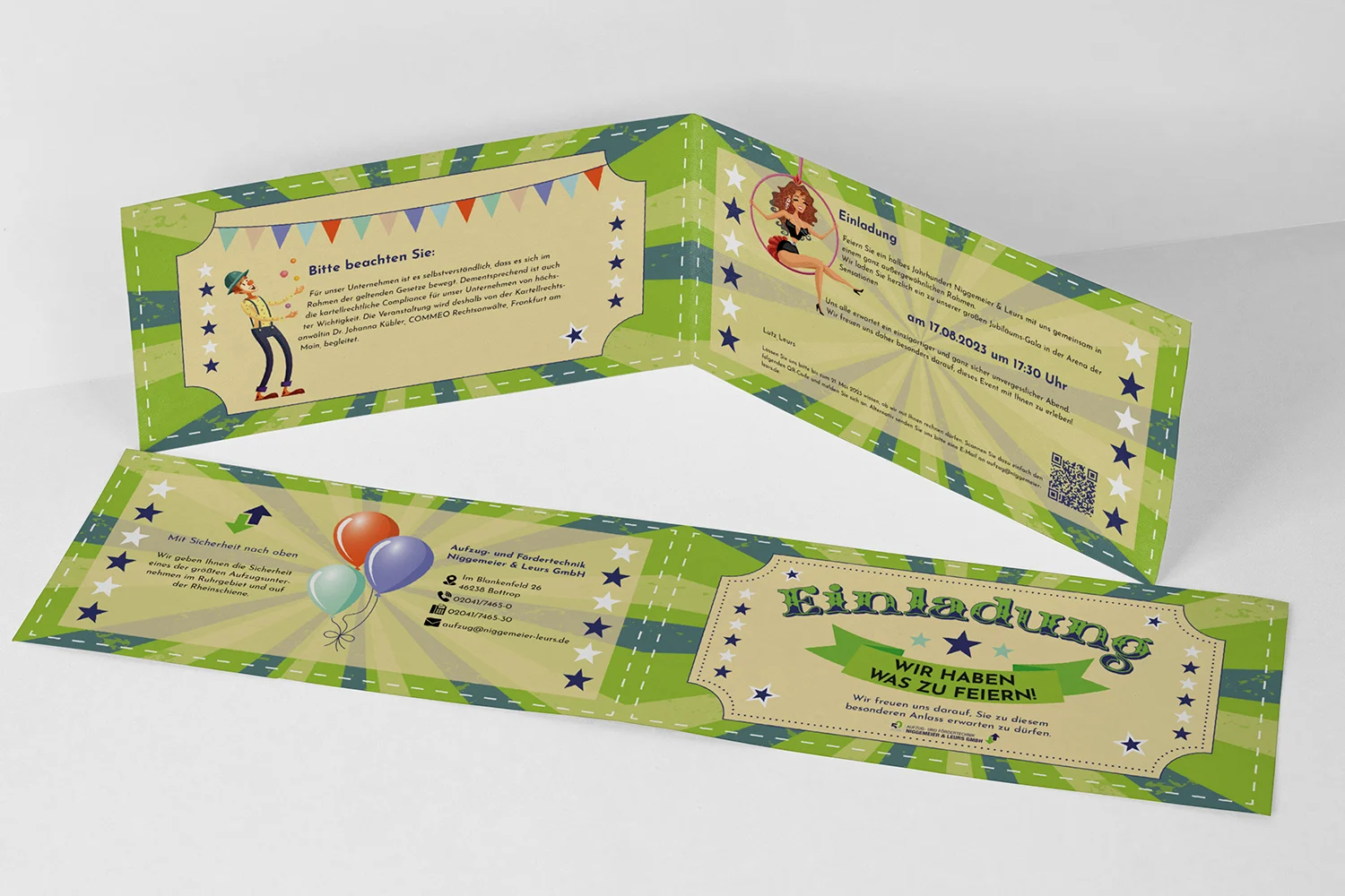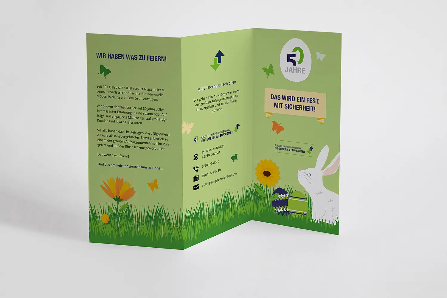 Für das 50-Jährige Firmenjubiläum von Niggemeier & Leurs haben wir die gesamte Feier ausgerichtet und passend dazu auch alle grafischen Arbeiten umgesetzt. Beginnend mit einem Gewinnspiel zu Ostern, mit Box-Design, Infoflyer und einer ersten Anspielung an die bevorstehende Veranstaltung. Später folgten dann Mailings, sowohl digital als auch postalisch, eine Landingpage zur Anmeldung für die Veranstaltung, Speisekarten, Servietten, Namensschilder, Leitsystem, Hinweisschilder und alles was sonst noch für das Event benötigt wurde.